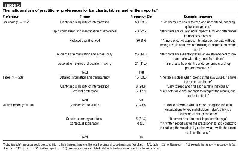 Another important takeaway from the study is how practitioners prefer data to be visualised, with a clear preference for simple and familiar formats that reduce cognitive load and allow for rapid interpretation.